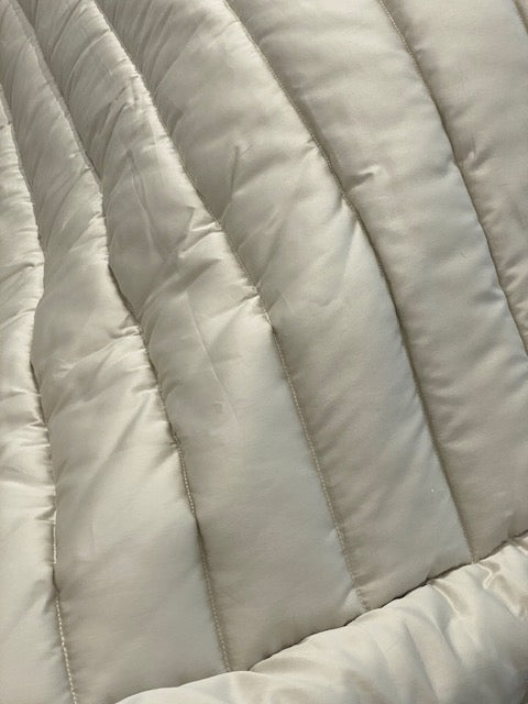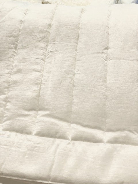 Origin: Made in Italy. Shell: Italian 100% Cotton Sateen or 100% Pre-washed Linen. Fabrication: Quilted one by one in Italy. Quilted shell, Polyester fill. Shams: Quilted fronts, solid-fabric backs. Width: 118-inches. Finishing: Shortened-flanges, approximate measurements: Quilted Coverlet: 3-inches; Shams: 2-inches; Boudoir: 2-inches. Hem: Plain hem.